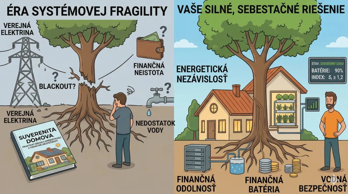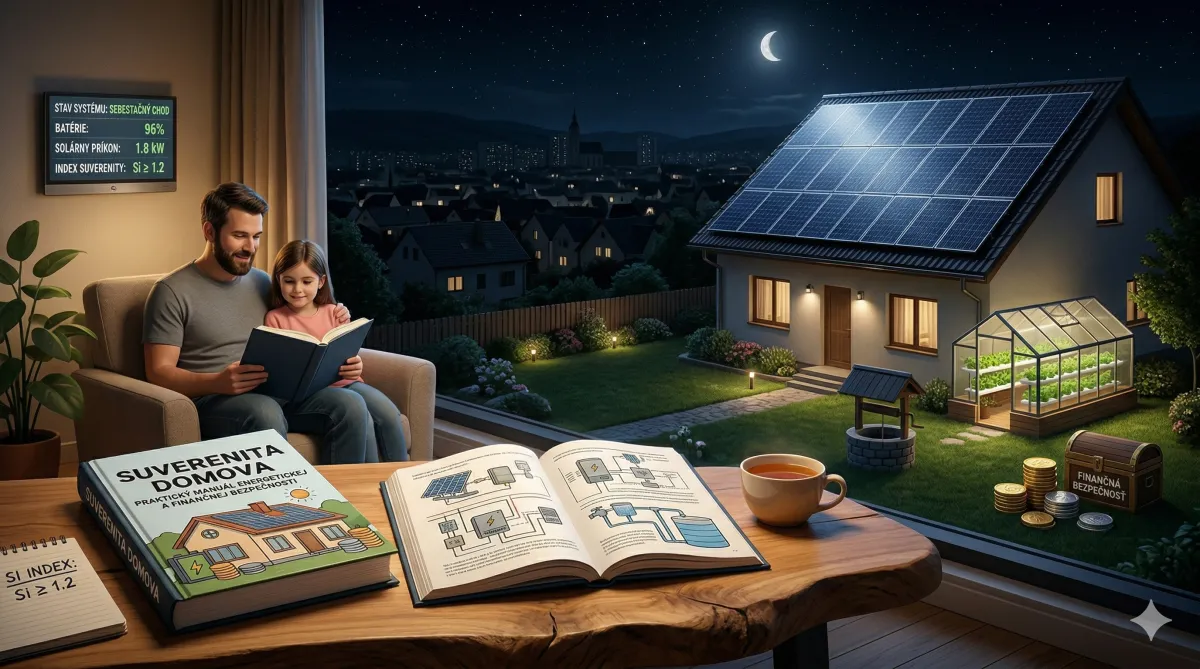 Áno – práve na to je tento e-book postavený. Bežné fotovoltiky zlyhávajú pri systémovom kolapse. My dimenzujeme systém tak, aby Index suverenity zostal nad 1,2 aj v najhoršom zimnom období bez siete. Plus fyzické zlato a sebestačnosť potravín, aby ste neboli odkázaní na štát ani na korporácie.